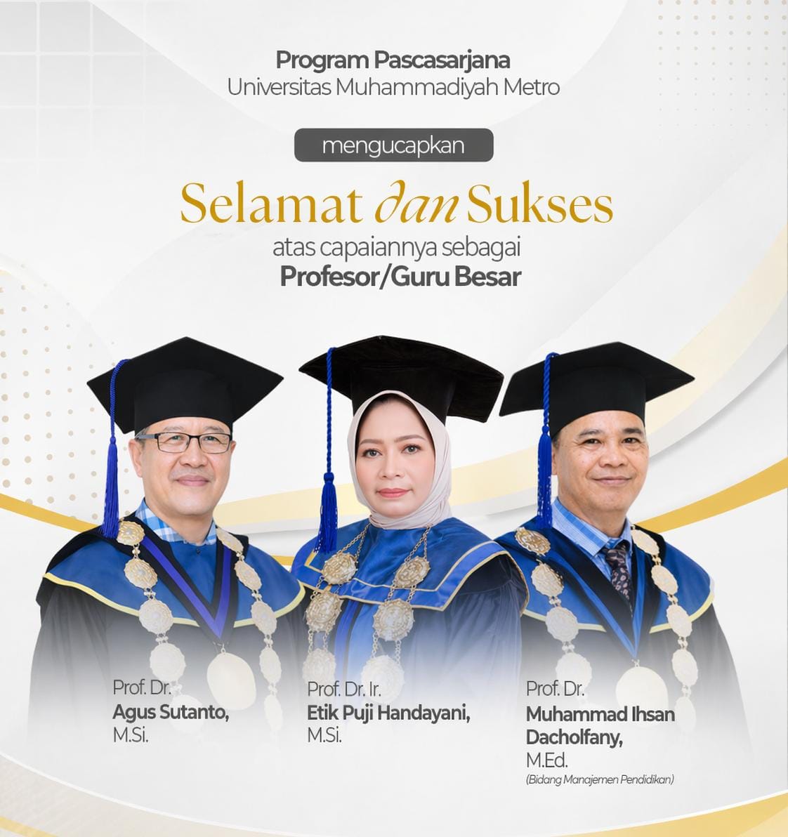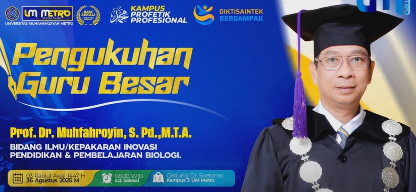 Pascasarjana UM Metro. Universitas Muhammadiyah Metro dengan visi Profetik Profesional Modern Mencerahkan kembali meneguhkan komitmennya sebagai institusi pendidikan tinggi yang unggul dengan mengukuhkan tiga Guru Besar/Profesor baru yaitu Prof. Dr. Agus Sutanto, M.Si. – Kepakaran di bidang Mikrobiologi. Prof. Dr. Ir. Etik Puji Handayani, M.Si. – Kepakaran di bidang Kesuburan Tanah dan Nutrisi Tanaman dan Prof. Dr. M. Ihsan Dacholfany, M.Ed. – Kepakaran di bidang Manajemen Pendidikan. Dengan penambahan Profesor tersebut, saat ini UM Metro telah memiliki total tujuh profesor yang menjadi pilar utama dalam pengembangan keilmuan, penelitian, dan pengabdian kepada masyarakat.
