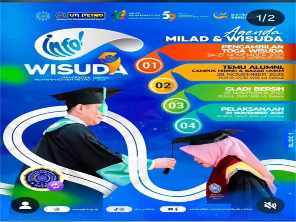 1. Jadwal Pengambilan Toga Wisuda Tahun 2025 Pascasarjana Hari Rabu Tanggal 25 November 2025 Lokasi Pengambilan Loket BAK Kampus I UM Metro 2. Temu Alumni Hari Jum'at 28 November 2025 Pukul 07.30 s.d selesai Kampus III…